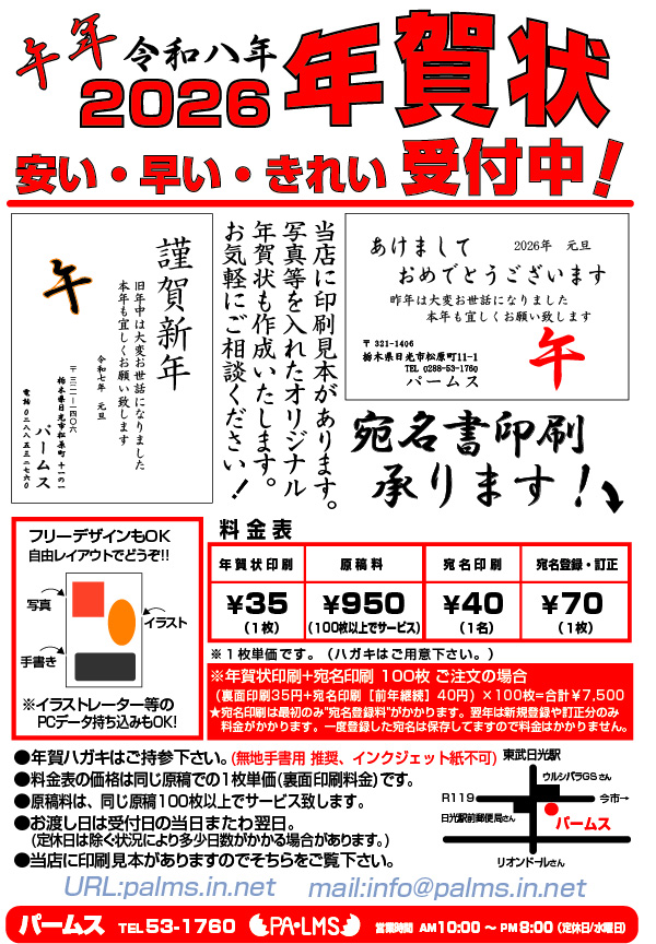 さて、パームスでは2026年(令和8年)の年賀状印刷受付中です。是非ご利用下さい・・。人気の宛名印刷も承りまぁ〜す!
